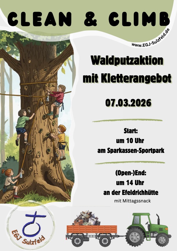 Du hast Lust etwas Gutes für die Umwelt zu tun und danach die Welt von oben zu sehen? Dann sei mit dabei, denn bald ist es soweit! 🙂Am Samstag den 07.03.26 findet unsere Aktion „Clean and Climb” statt. Wir treffen uns um 10 Uhr am Parkplatz der Ravensburghalle und des Sparkassen Sportparks.Von dort aus starten wir und werden im Laufe des Vormittags die Wege und Wälder von Müll befreien. Denkt dazu bitte an dem Wetter angepasste Kleidung, die auch schmutzig werden darf sowie (wenn vorhanden) an eigene Handschuhe. Im Anschluss treffen wir uns an der Efeldrichhütte. Dort gibt es dann einen Mittagssnack und es geht zum „Climb“- Teil der Aktion. Wir haben vor Ort eine Baumkletterstation vorbereitet, dort haben alle, die wollen, einmal die Möglichkeit das Klettern auszuprobieren und die Welt von oben zu betrachten. Offizielles Ende der Aktion ist um 14 Uhr. Wer darüber hinaus Lust hat darf auch gerne noch etwas länger bleiben – weiter klettern und die Natur genießen. 🌳 Ihr seit alle herzlich dazu eingeladen, einen schönen Tag mit uns zu verbringen und dazu gleichzeitig etwas gutes für unsere Umwelt zu machen.
